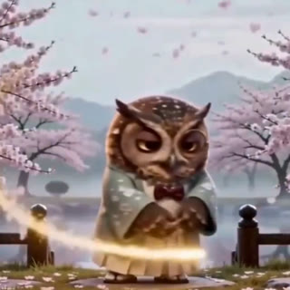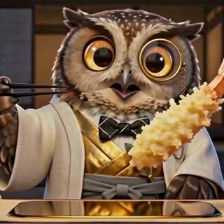 A monocled owl with a golden feather pen moves through cherry gardens, temple kitchens, indigo depths, campfires, and silver-snow landscapes. Grand entrance, gentle mishap, magical recovery — and as each tale resolves, the perfect dish lands before you.